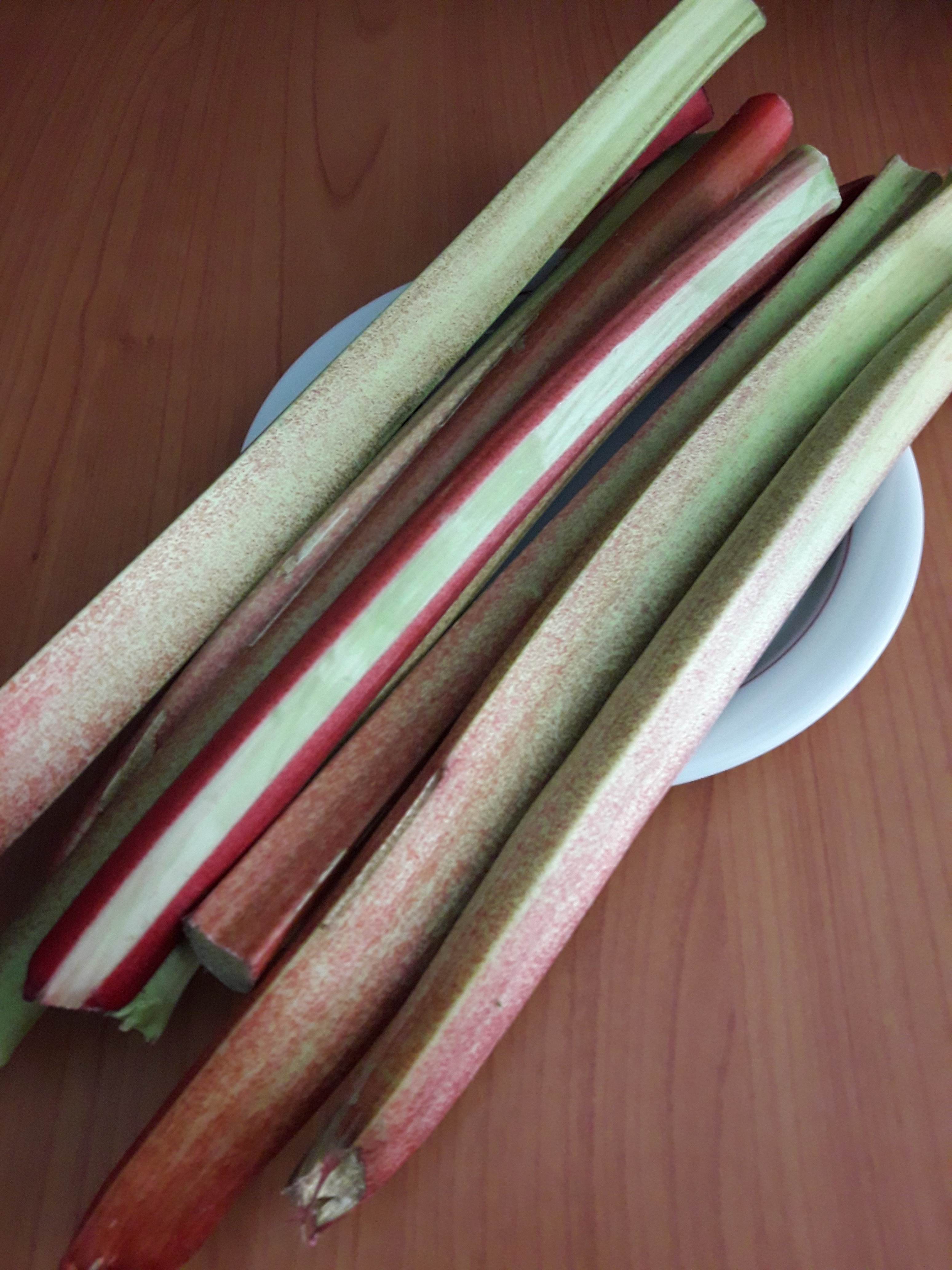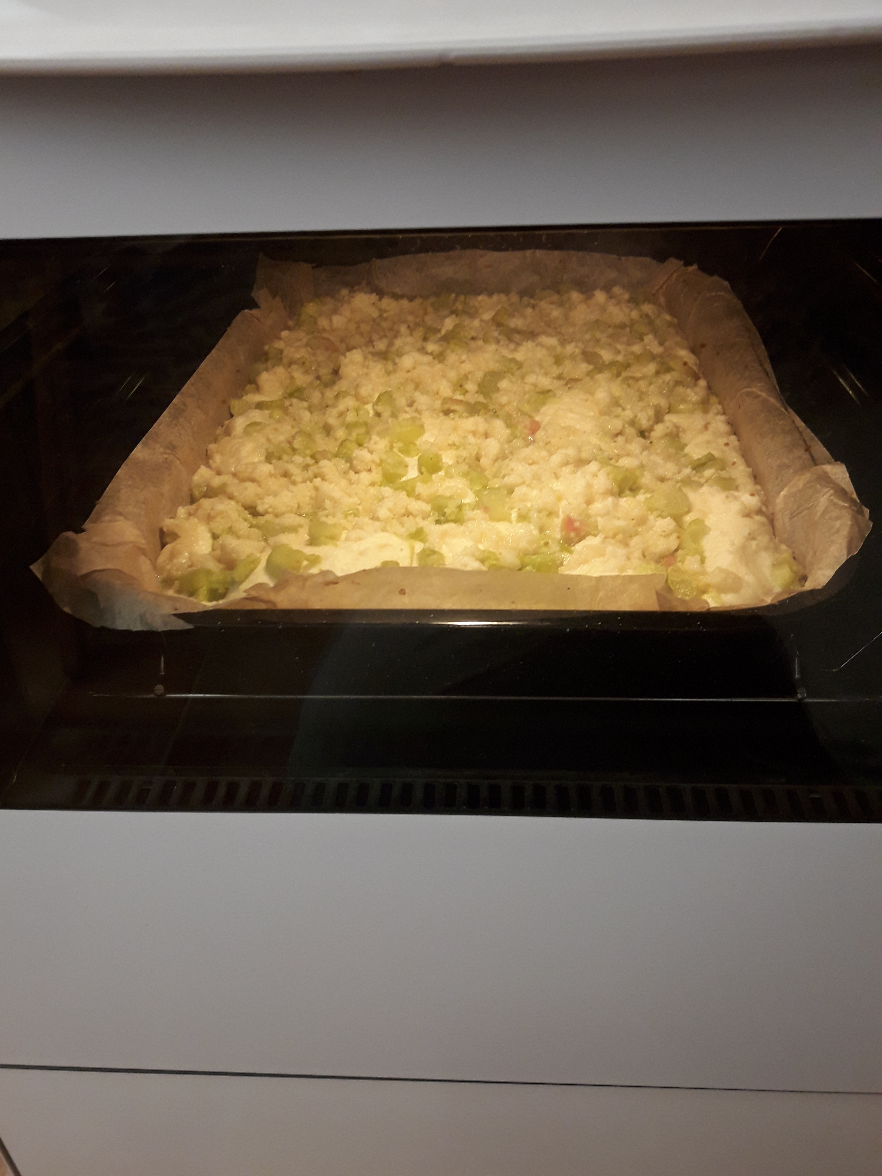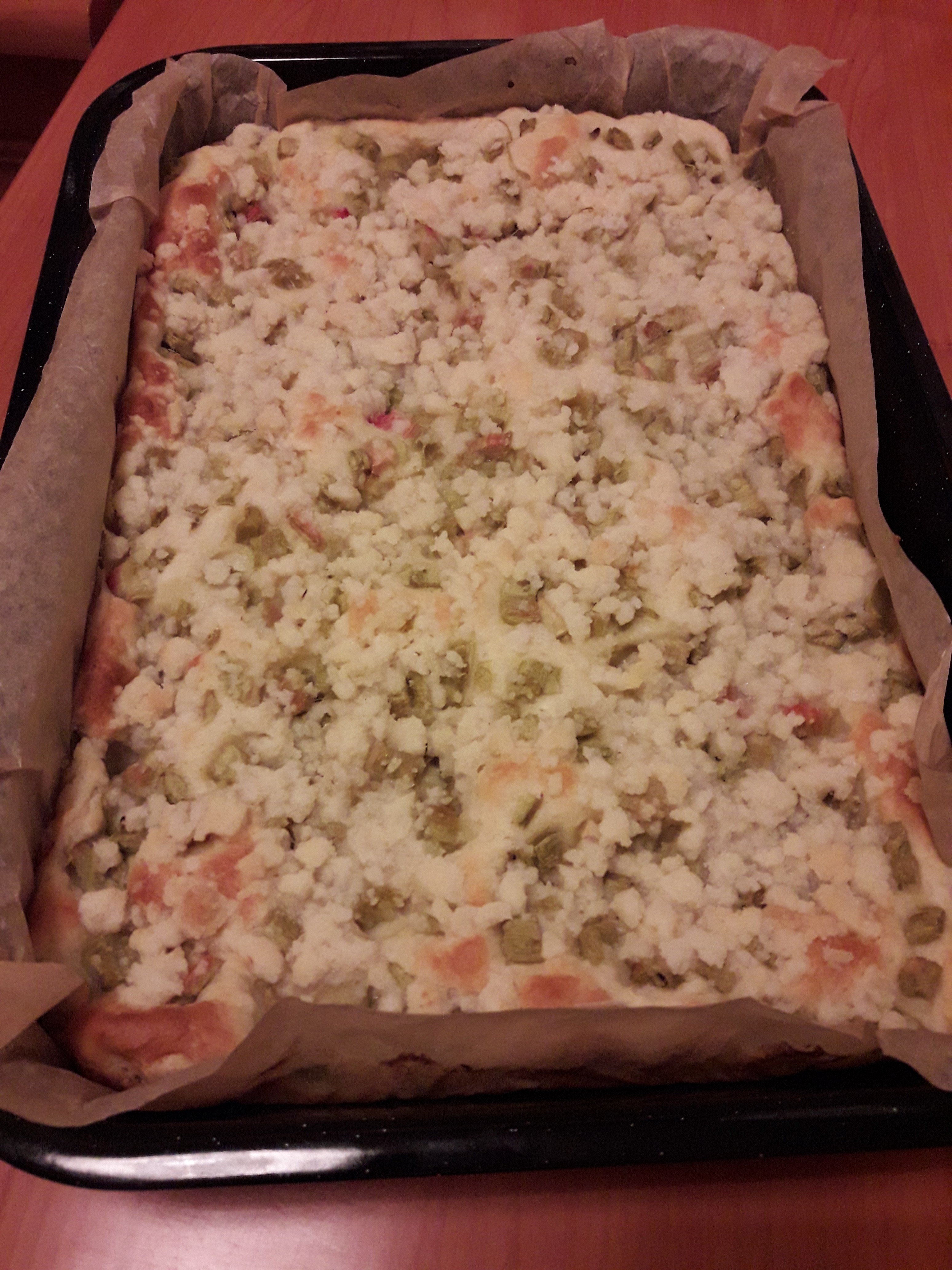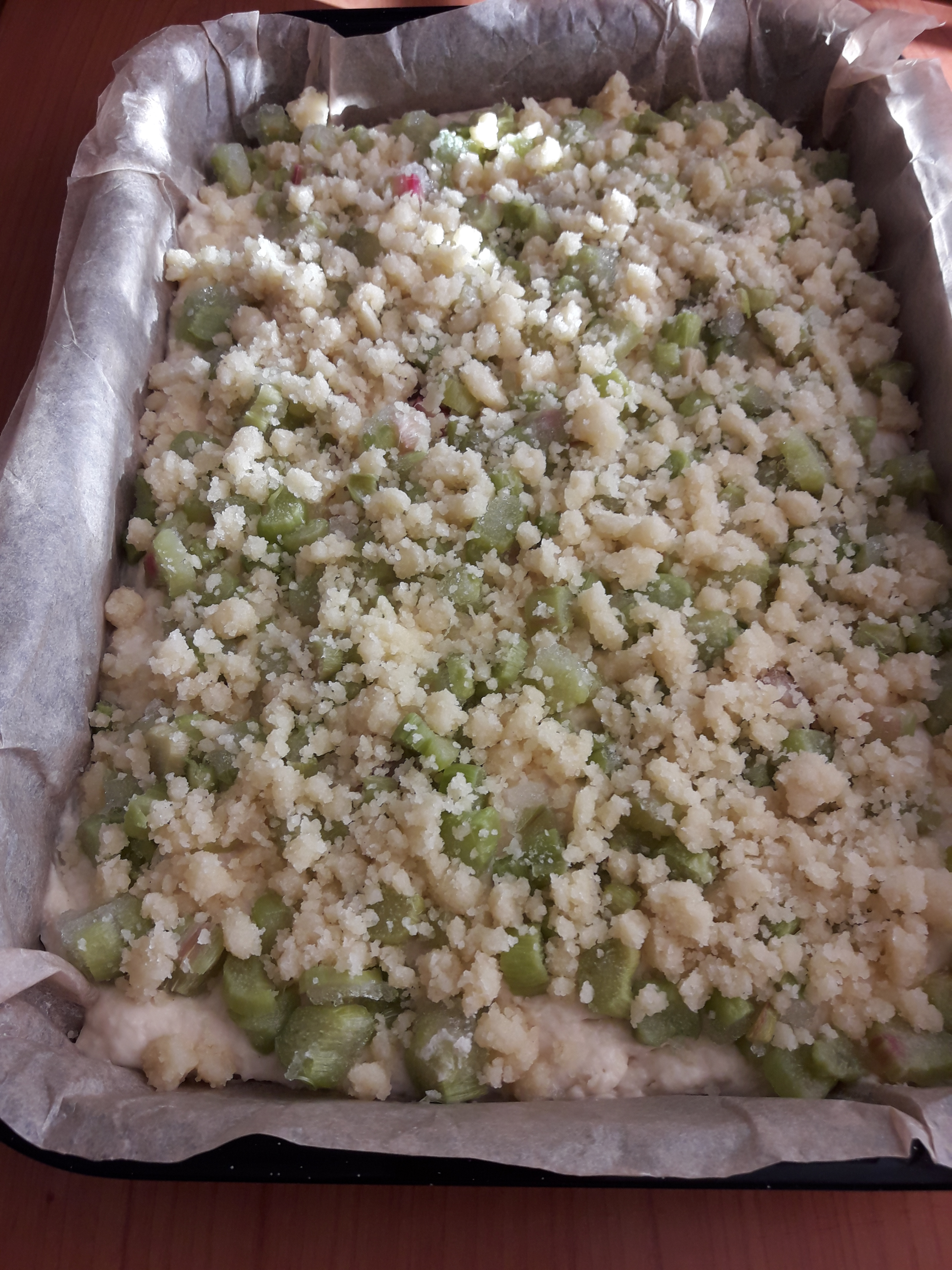 7. na wyrośnięte ciasto układamy pokrojony rabarbar i posypujemy kruszonką