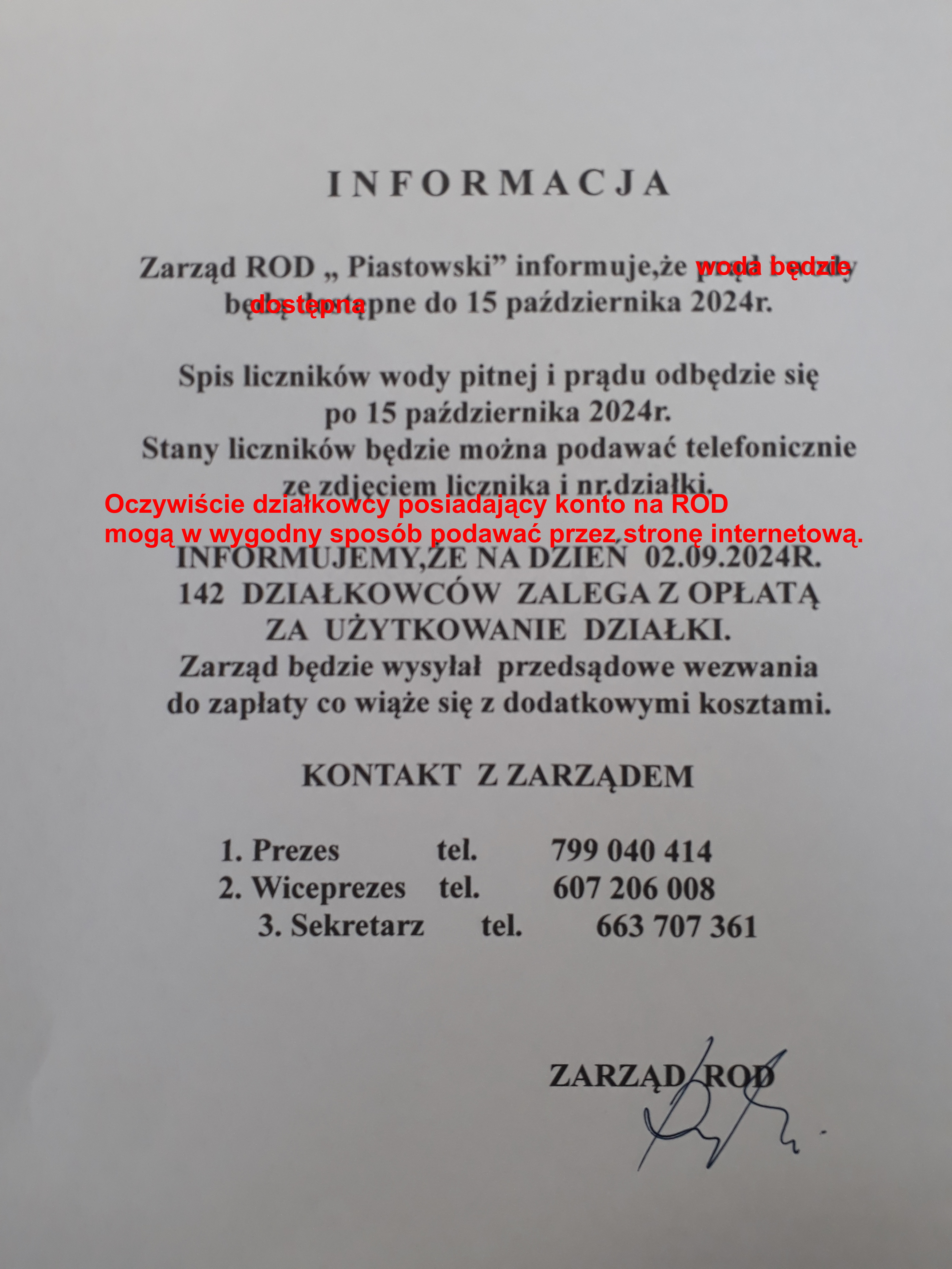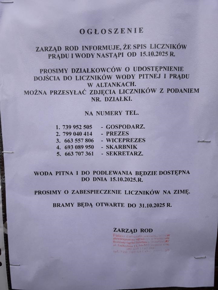 5. Działkowcy, u których nie zostały spisane liczniki (prąd, woda pitna), proszeni są o kontakt z Gospodarzem pod numerem telefonu 739 952 505