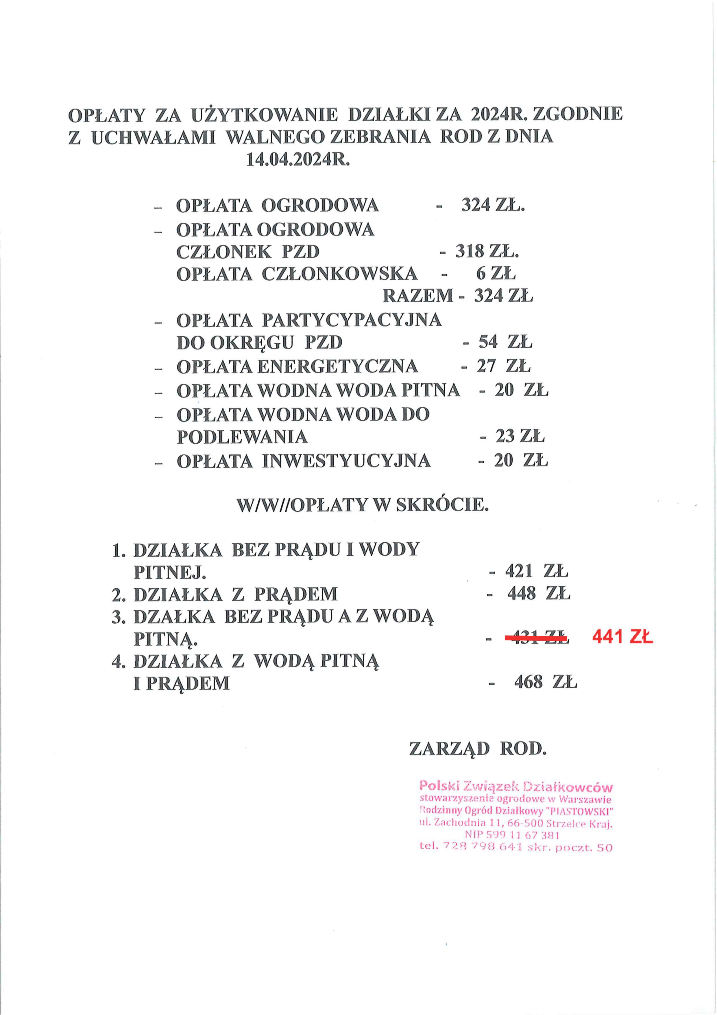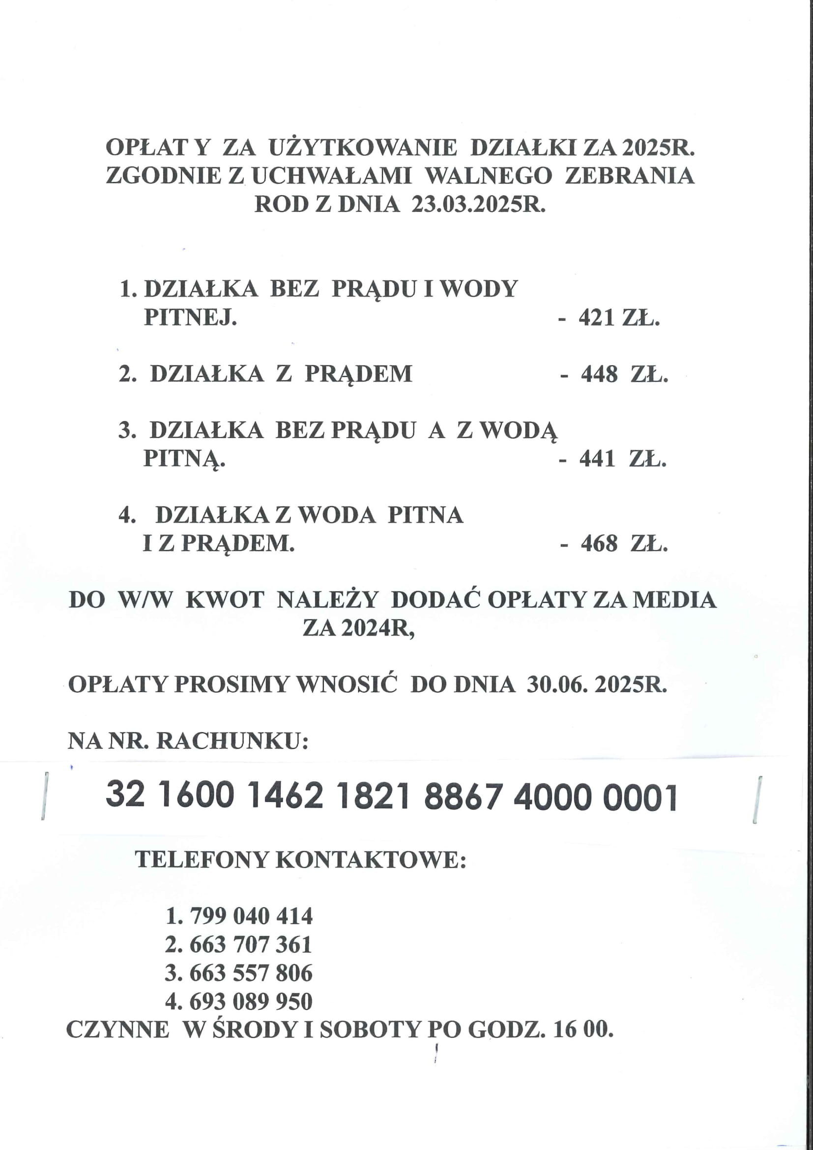 Uwaga !!! W zestawieniu błędnie była podana zsumowana kwota opłaty za działkę z wodą pitną , bez prądu. Poprawna kwota to 441zł.Jeżeli ktoś dokonał już wpłatę proszony jest o dopłatę różnicy wynoszącej 10zł..