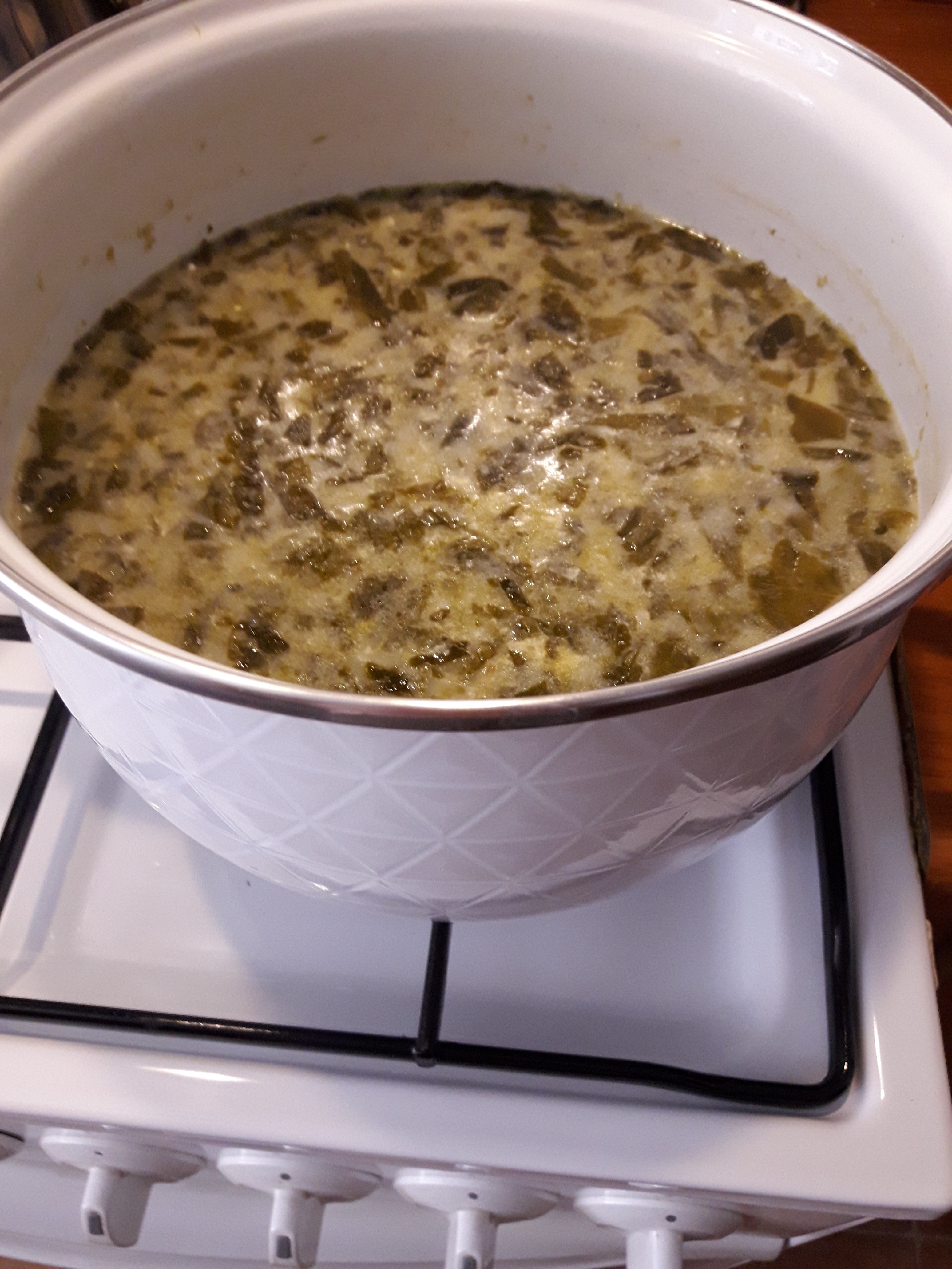 5. dodajemy podsmażony szczaw do wywaru i gotujemy kilka minut